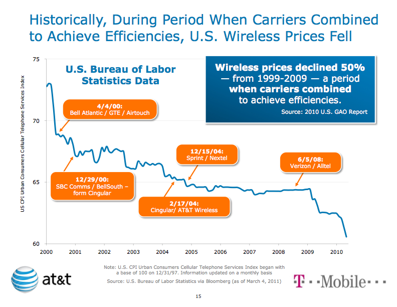 As for complaints from rivals like Sprint that the acquisition would negatively impact competition, AT&T denies that would be the case. In fact, it's claimed, US wireless prices have historically fallen when carriers have combined their efforts; AT&T flags up the Sprint/Nextel and Verizon/Alltel deals as evidence, in fact.