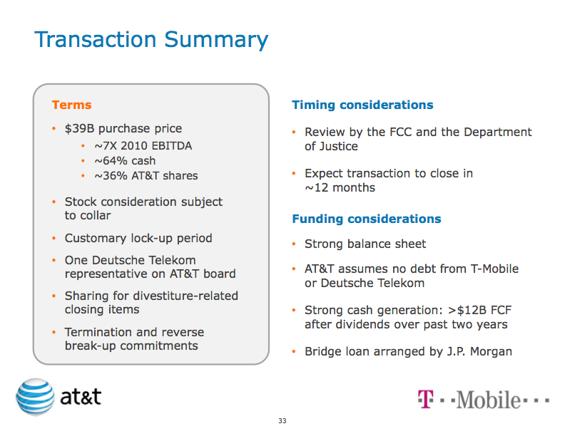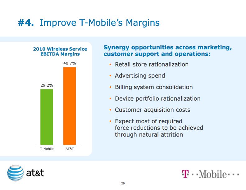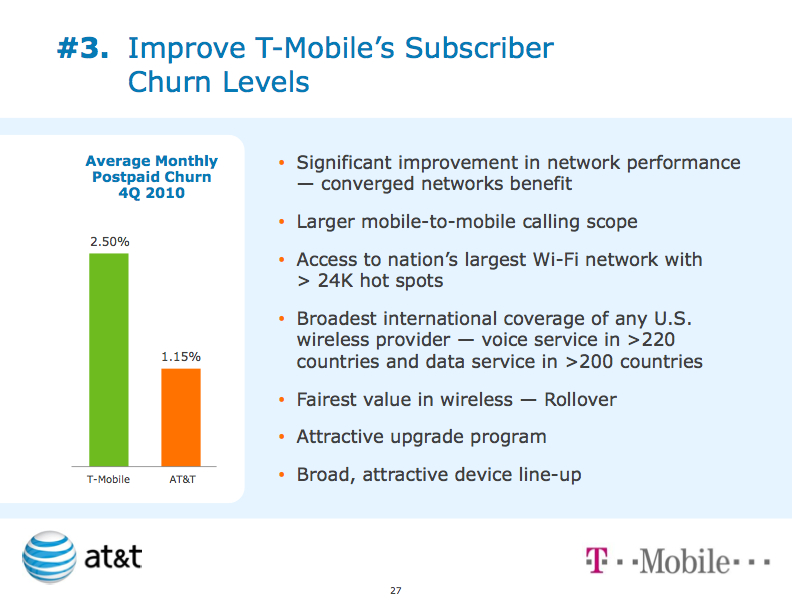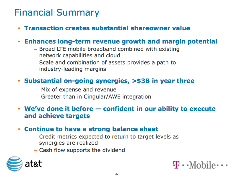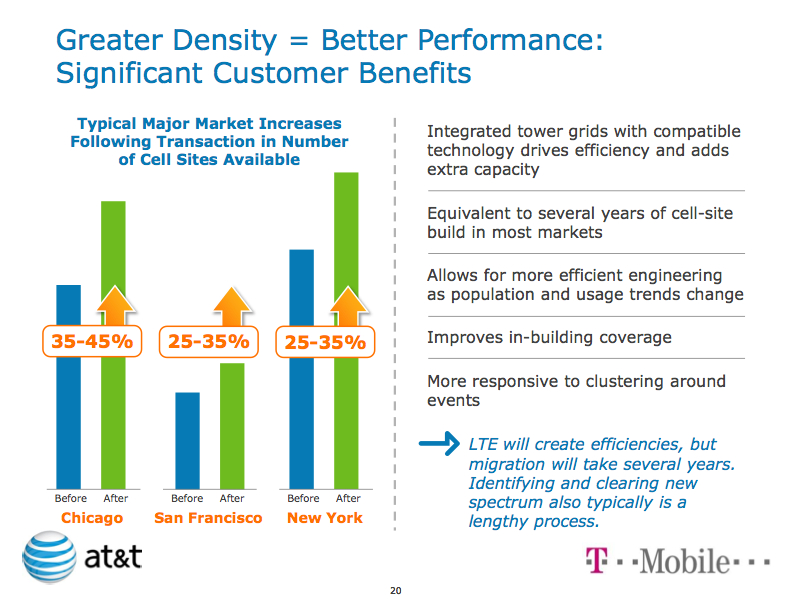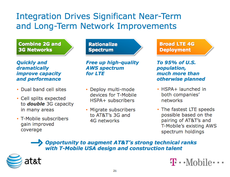 AT&T is doing its utmost this morning to convince investors, regulators and the general public that its proposed acquisition of T-Mobile USA is more than just a good idea for the carrier's shareholders. In the AT&T presentation [pdf link; see gallery after the cut], the carrier promises that AT&T and T-Mobile customers will see benefits within a year of the deal closing; that will include freeing up T-Mobile's 1700MHz AWS spectrum for AT&T to use for LTE roll-out.