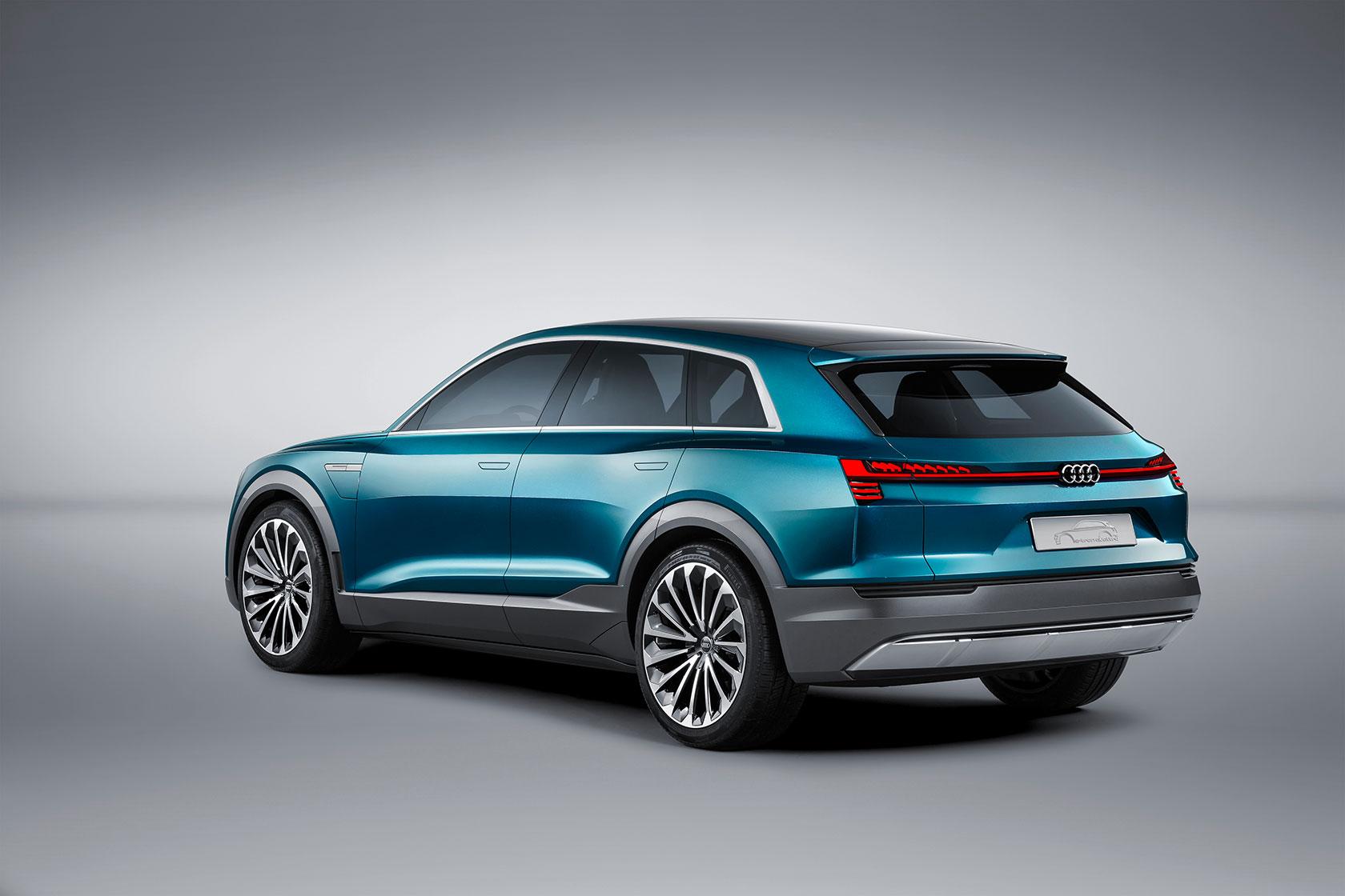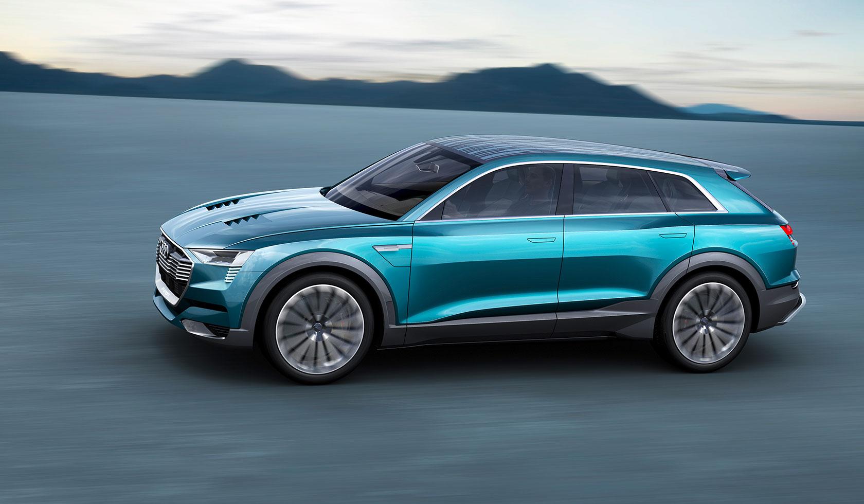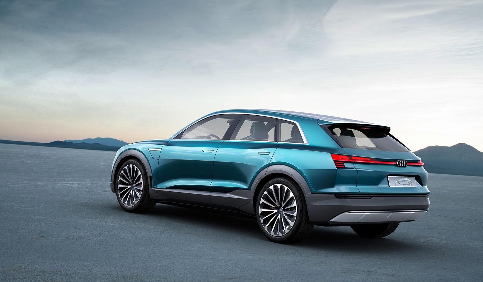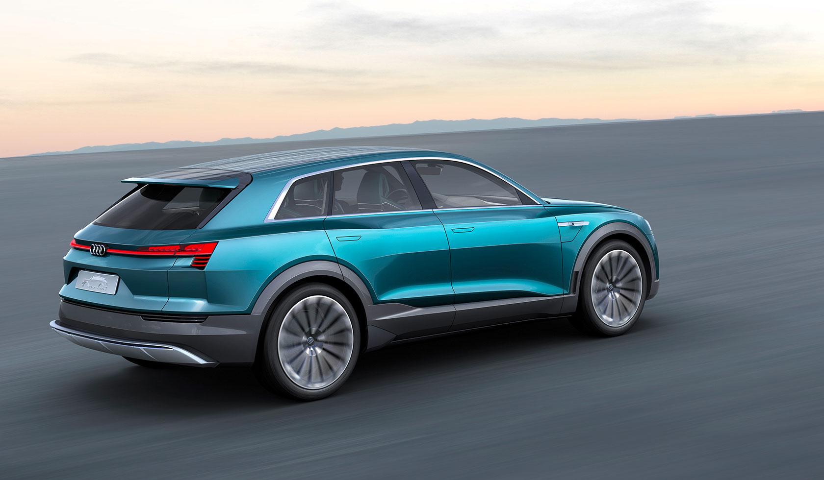 The Audi e-tron Quattro Concept vehicle has been shown in detail this week at the Frankfurt Auto Show 2015. This vehicle works with an electric drivetrain up to 370 kW and has a front-end electric motor, rear electric motors, and a liquid cooled lithium-ion battery with 95 kWh underneath.