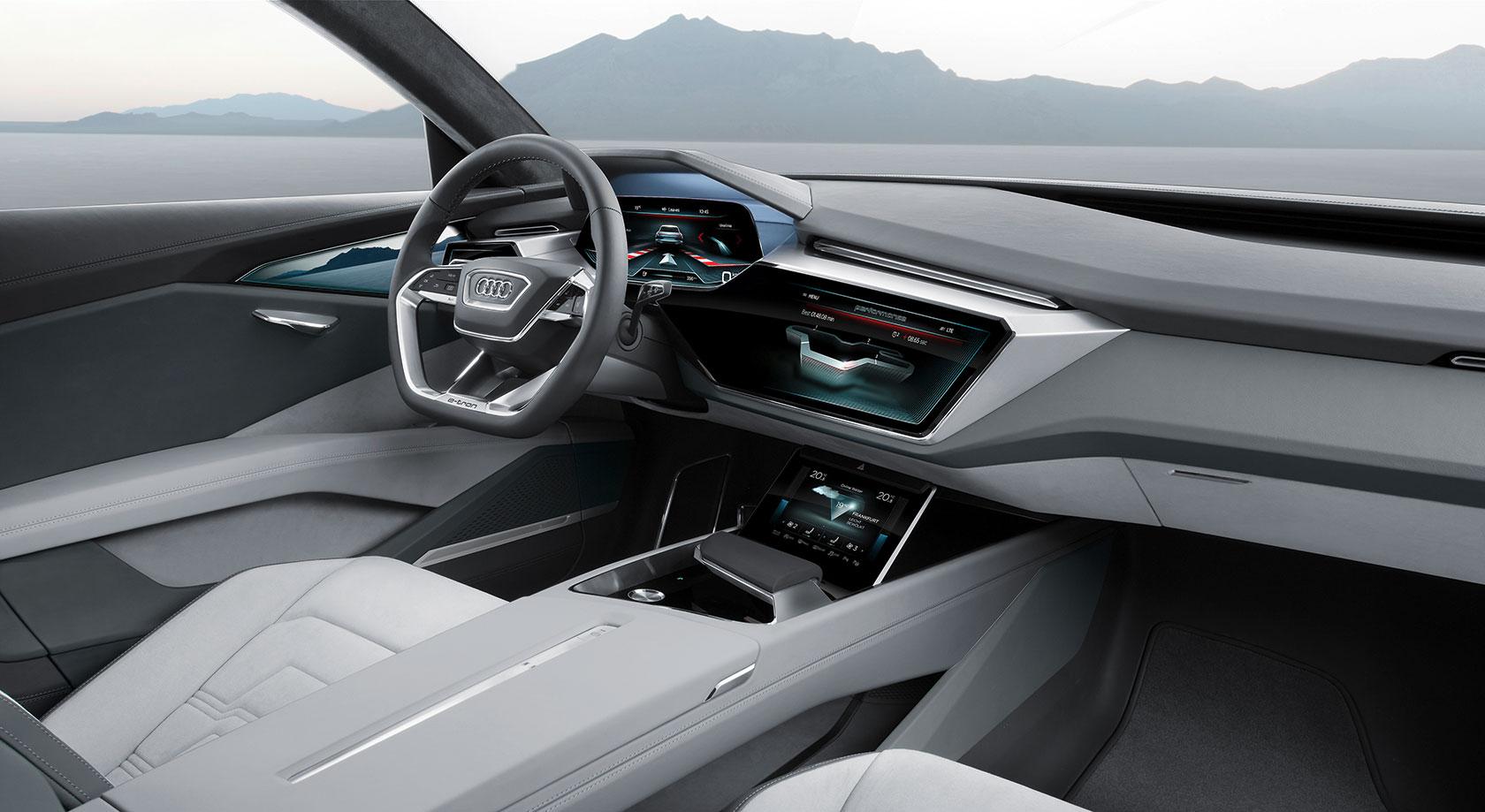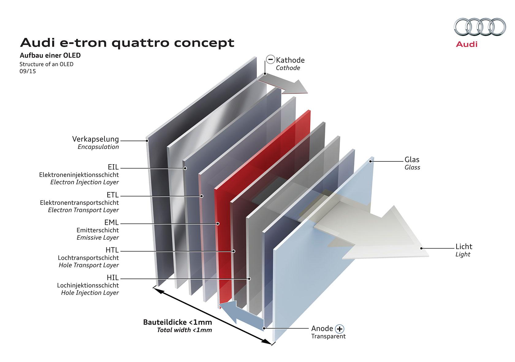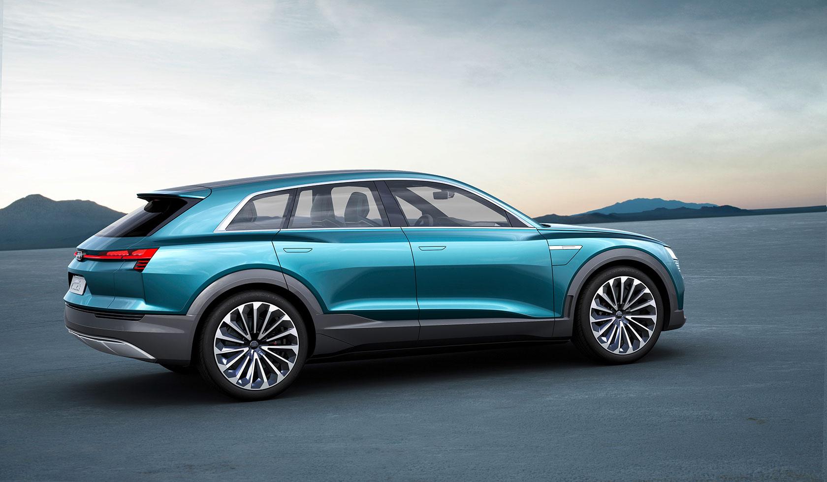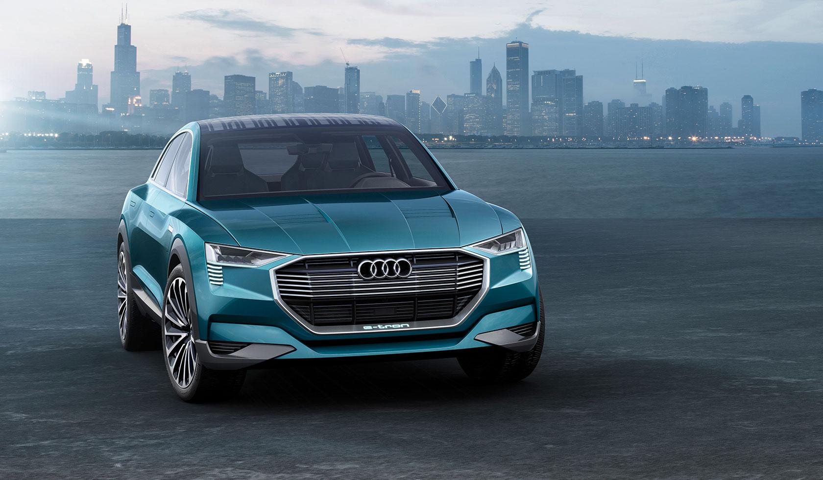 The Audi e-tron Quattro Concept vehicle has been shown in detail this week at the Frankfurt Auto Show 2015. This vehicle works with an electric drivetrain up to 370 kW and has a front-end electric motor, rear electric motors, and a liquid cooled lithium-ion battery with 95 kWh underneath.