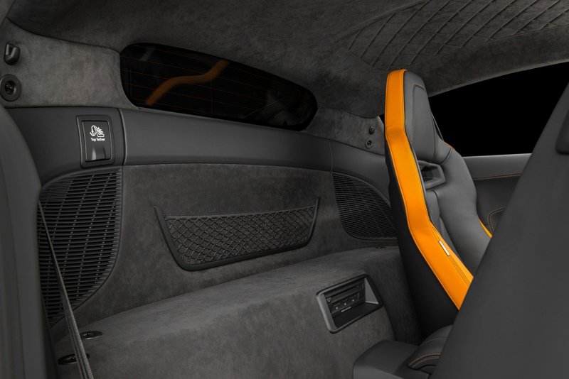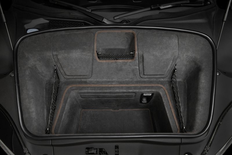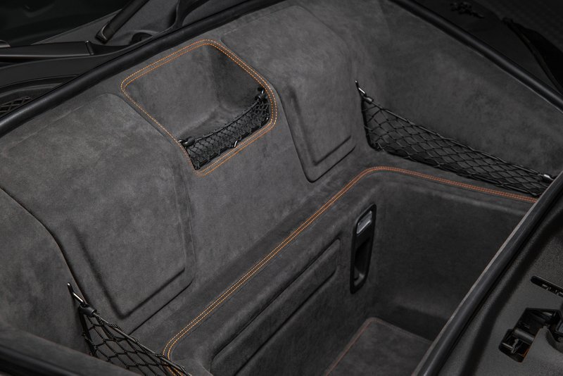 It's not the only interior change. Audi exclusive finishes the full leather seating in Black/Signal Orange, while the door sills are also trimmed in leather, not to mention illuminated with custom "one of 25" logos in carbon matte. The luggage compartment is trimmed in Alcantara, as are the rear panel and rear shelf. There's even an Alcantara headliner, with diamond-stitching.