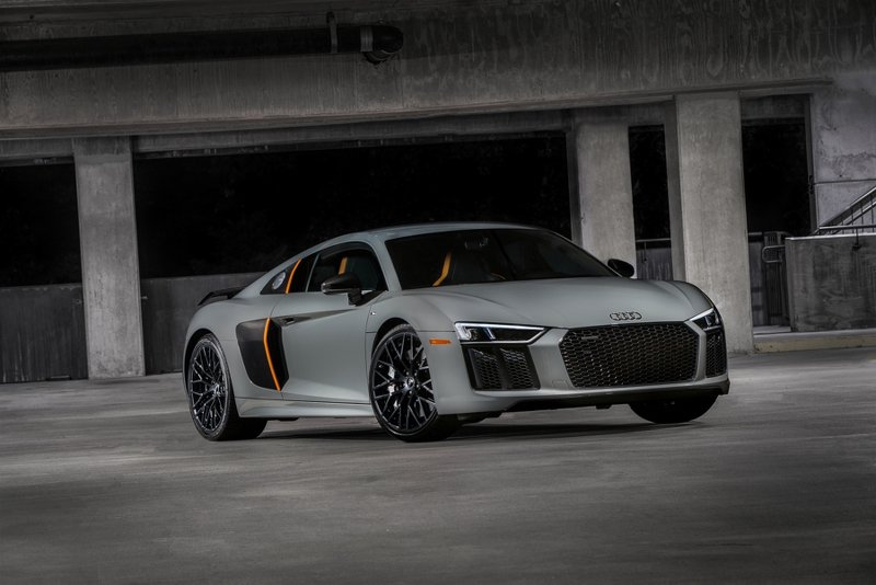 The 2017 R8 V10 plus exclusive edition will come to the United States through the company's Audi exclusive program, effectively the automaker's bespoke arm which customizes production cars for well-heeled clientele. In this particular case, it's finished in Quantum Gray with the Titanium Black-optic exterior package, and rolls with a Carbon sideblade with Solar Orange stripe. The tires have a 20-inch 10-spoke-Y design in high-gloss anthracite, and the steering wheel has its own Signal Orange 12 o'clock marker.