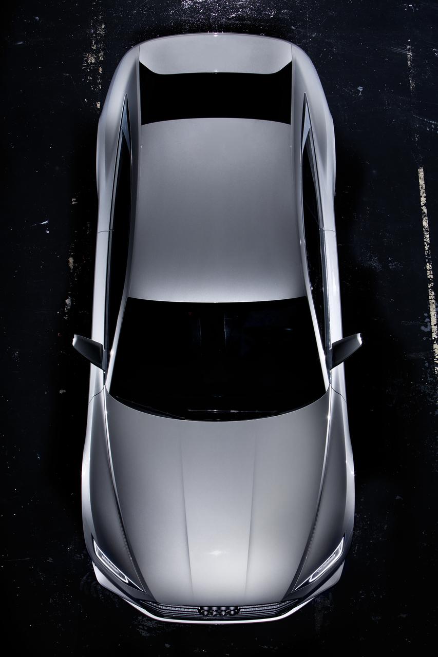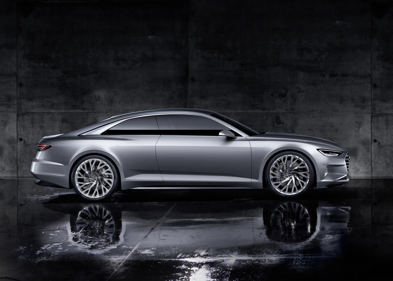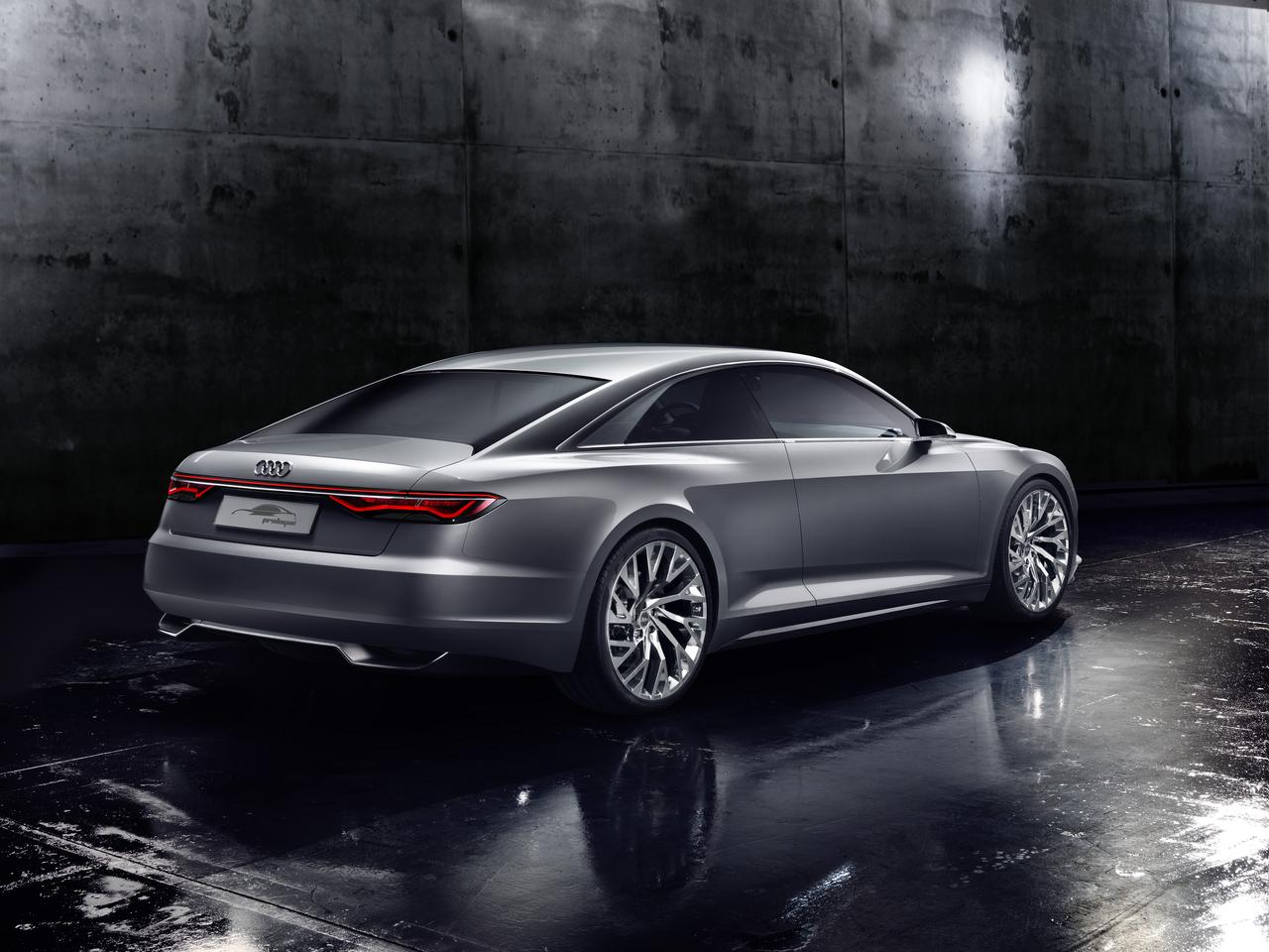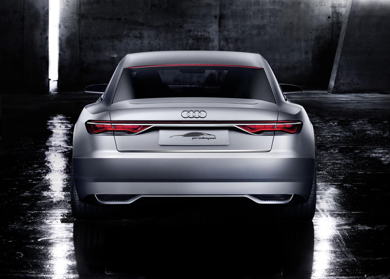 Compared to the Audi A8 production model, the Prologue is noticeably shorter and flatter, with a length of 5.10 m, a width of 1.96 m, and a height of 1.39 m. Immediately obvious as well is the car's low front end, with an even wider radiator grill that is positioned lower than most cars today. View head-on, the Prologue has a distinct horizontal design that its designers believe convey an atmosphere of powerful dynamics. That perception is confirmed by the Prologue's 4.0 liter TFSI engine, delivering 605 hp of power and a 553.2 lb-ft torque that lets it accelerate from 0 to 100 km/h in just 3.7 seconds.