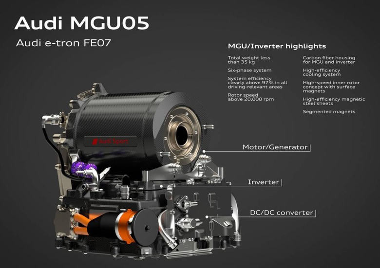 The centerpiece of it all is Audi's proprietary MGU05 electric powertrain. It's a lightweight, one-speed drivetrain that weighs less than 77 pounds (35 kilograms). The MGU/Inverter unit has a high-efficiency cooling system, six electrical phases, and a high-speed inner rotor with surface magnets.