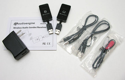 These two devices work on the 2.4GHz band, but use a protocol that isn't affected by WiFi, microwave ovens, Bluetooth, mobile phones, cordless phones, or any of that other stuff that normally buggers things up. You get one USB charging block for your home outlet to plug one of them into, the speakers they are intended for have powered USB ports on them, so presumably you'd plug the other one into that, then you get a pair of headphone cables with male connections on both ends and one Y-splitter with RCA jacks on the other end.