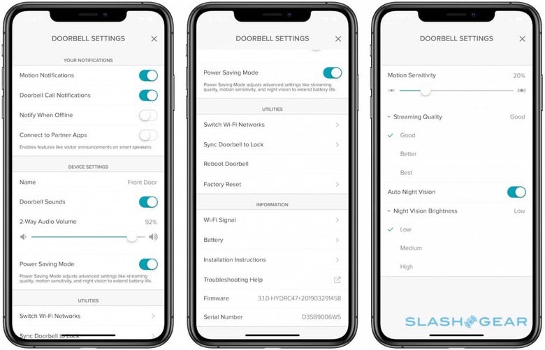 The motion sensor automatically turns on the light ring around the doorbell button when triggered, though unlike the Doorbell Cam Pro there's no LED floodlight. Instead it uses infrared LEDs for night vision. You can also optionally receive notifications whenever motion is spotted. A Power Saving Mode trades night vision and streaming quality, as well as motion sensitivity, in the name of better battery life. Turn it off, and you can manually adjust motion sensitivity, night vision brightness, and video quality. In the video below, the night vision brightness was at its lowest setting, while video quality was at its best.