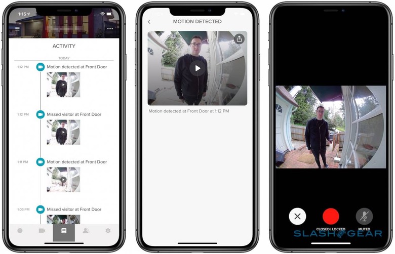 When you're viewing live video, either because someone rang the doorbell or because you switched it on manually, you can hear through the View's microphone. Press the mic button in the app, and you can talk to whoever is outside.