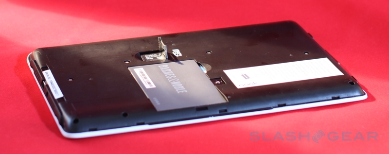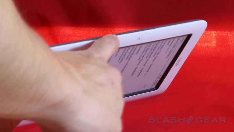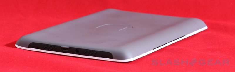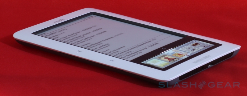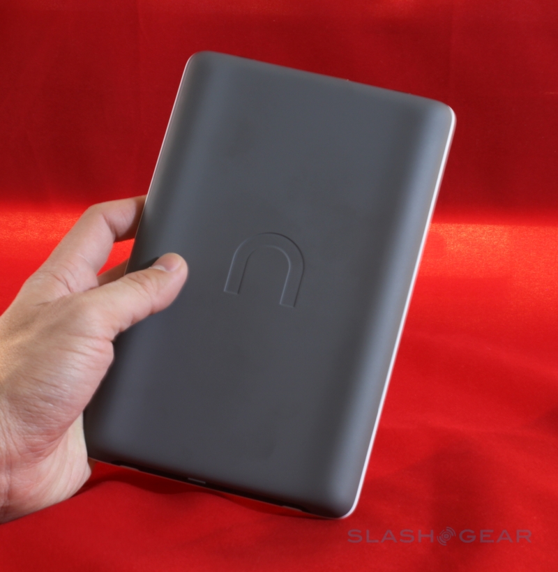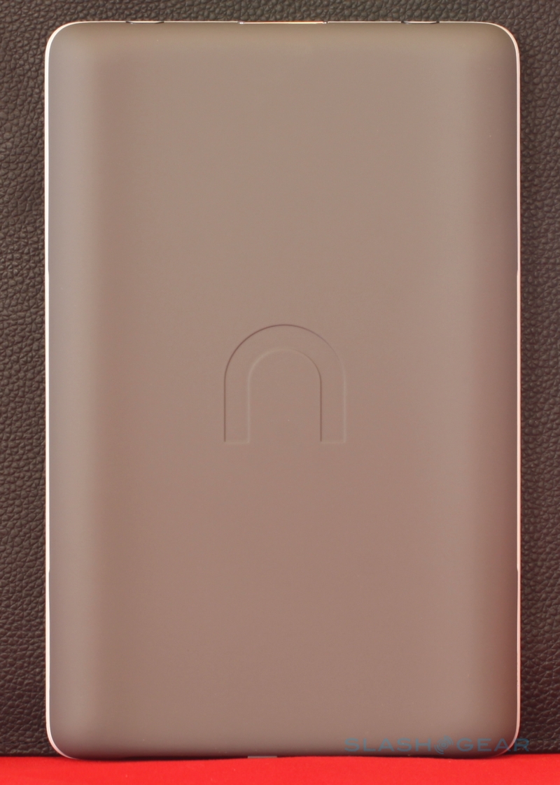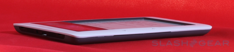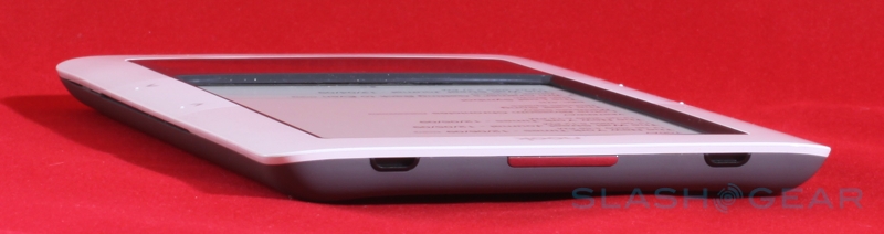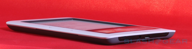 On the base of the nook there's a microUSB port – used for charging and for side-loading content – together with a 3.5mm headphone socket and (mono, despite the two grills) speaker, and you also get a microSD card slot for expanding the 2GB of onboard memory (which B&N say is good for up to 1,500 ebooks). The physical shape of the nook is slightly bowed in cross-section, with the left and right edges being thicker and then tapering in to the center; that adds up to a device that's arguably easier to hold than the narrower but flat Kindle. There's also a user-accessible battery – unlike the Amazon device – though the payoff is a slightly reduced runtime in comparison: up to 10 days with the wireless shut off, B&N say, versus the Kindle's 14 days.
