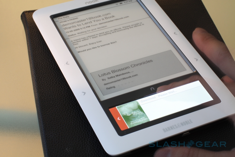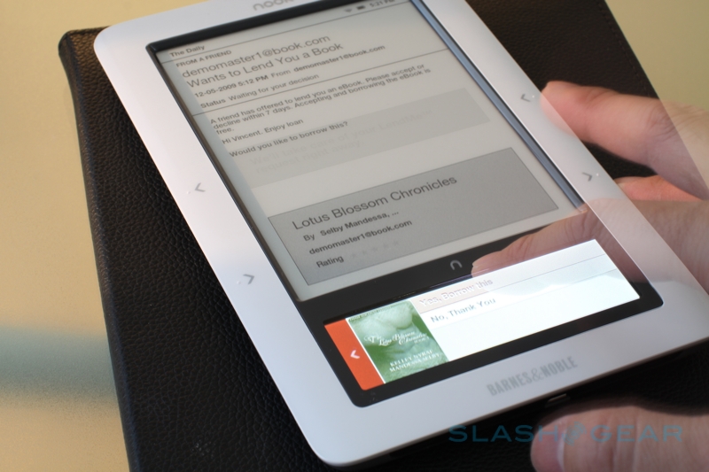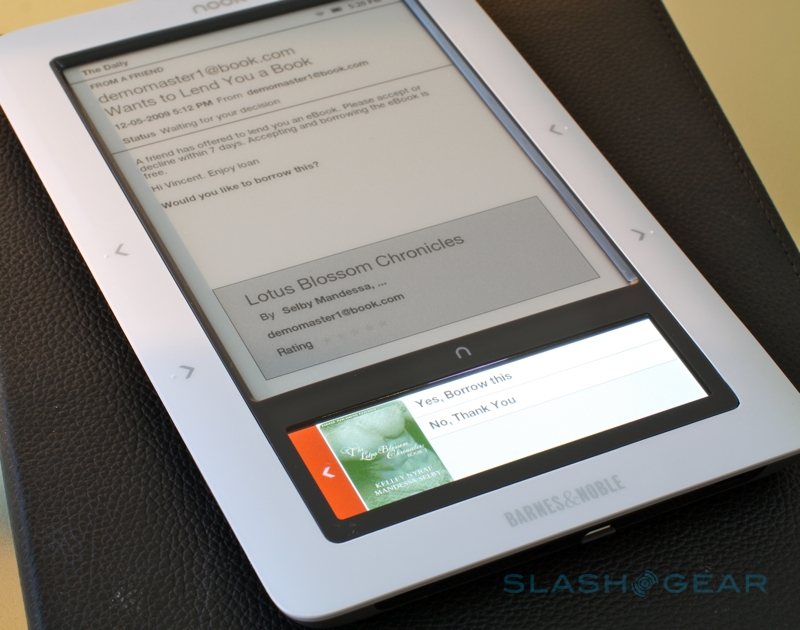 Second is the ability to lend ebooks between friends and family with B&N LendMe, just as you might pass around a recommended paperback. The usual period is fourteen days – though that might change on a per-title basis, depending on publisher request – and the recipient need not have a nook of their own; they can use Barnes & Noble's free eReader app which is available on PC, Mac, iPhone and iPod touch. The BlackBerry client will be updated with ebook-lending support early in the New Year, we're told, as well as versions of the software for other smartphones including Windows Mobile and Android.
