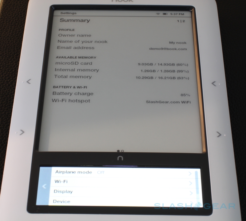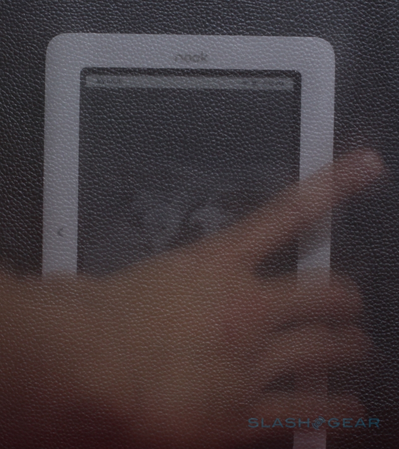 B&N's use of a touchscreen allows for faster navigation than using the E Ink panel to show menus. Whereas every menu refresh on E Ink requires the whole screen to be redrawn – and therefore a pause as the panel blacks out then comes back to life with the new layout – the LCD display is as responsive as a smartphone and of course shows color. 3.5-inches, but squeezed into a letterbox aspect, the panel is broad enough to show five book covers with the front text still legible. Since a capacitive rather than resistive touchscreen is used, finger-swipes can be light and gentle (though it also means there's no using a regular stylus, and no ability to add handwritten notes). The "n" logo called the nook button in-between the E Ink and touchscreen displays acts in a similar way to the iPhone's home key, waking the LCD if it has turned off (you can set the time-out to 10, 30 or 60 seconds, and either manually adjust brightness or leave it on automatic), and returning to the top navigation level. However we have had a few occasions where the button – which is touch-sensitive rather than a physical key – fails to register first time, and requires a second tap. It's also worth noting that the physical clicking of the page-turn buttons is reasonably loud. While Barnes & Noble isn't broadcasting the page swipe gesture feature for the touchscreen, it is available – it needs to be dark. They're working to optimize the experience – so stay tune.