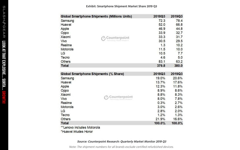 According to Counterpoint Research, Samsung currently has 20.6% of the global smartphone shipments for the third quarter of the year 2019. That's very similar to the share suggested by Strategy Analytics for this same period – they suggest Samsung has 21.3% of the global smartphone shipments for the quarter.