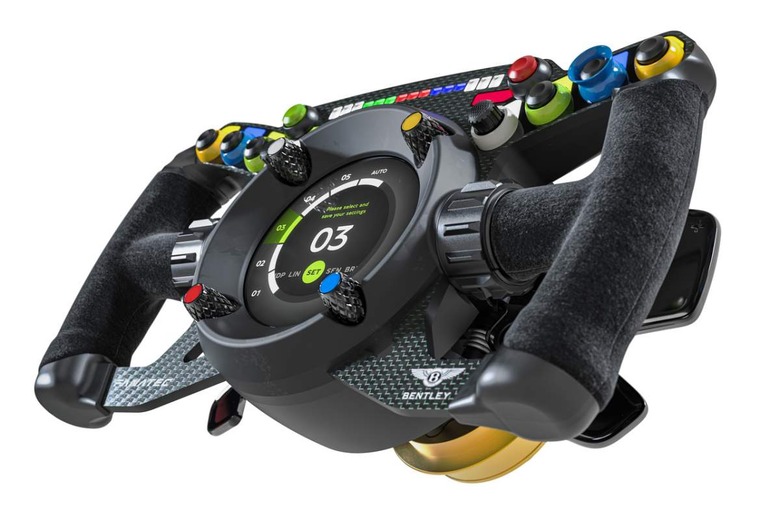 In actuality, Bentley's newest GT3 steering wheel will come standard in the hardcore Continental GT3 Pikes Peak racing car. The ultra-lightweight construction is sure to delight professional racers with its magnesium alloy and carbon fiber construction. But with a nifty circular digital screen and bespoke knurled rotary dials, gamers can experience the thrill of piloting one of the world's most powerful cars.