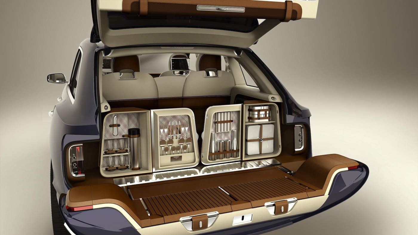The falcon – which Bentley brought on stage as part of their concept demo – doesn't actually come with the car, as that could prove something of a distraction if it burst out of the glove compartment. Instead, you get bespoke picnic hampers in the trunk, along with a pull-out awning and a pair of concealed umbrellas.