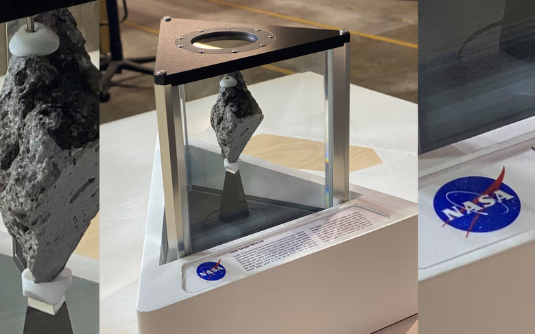 The Biden Administration requested the sample from the Lunar Sample Laboratory Facility at NASA's Johnson Space Center in Houston. This triangular case carries a moon rock, suspended in space, available for viewing from several angles.