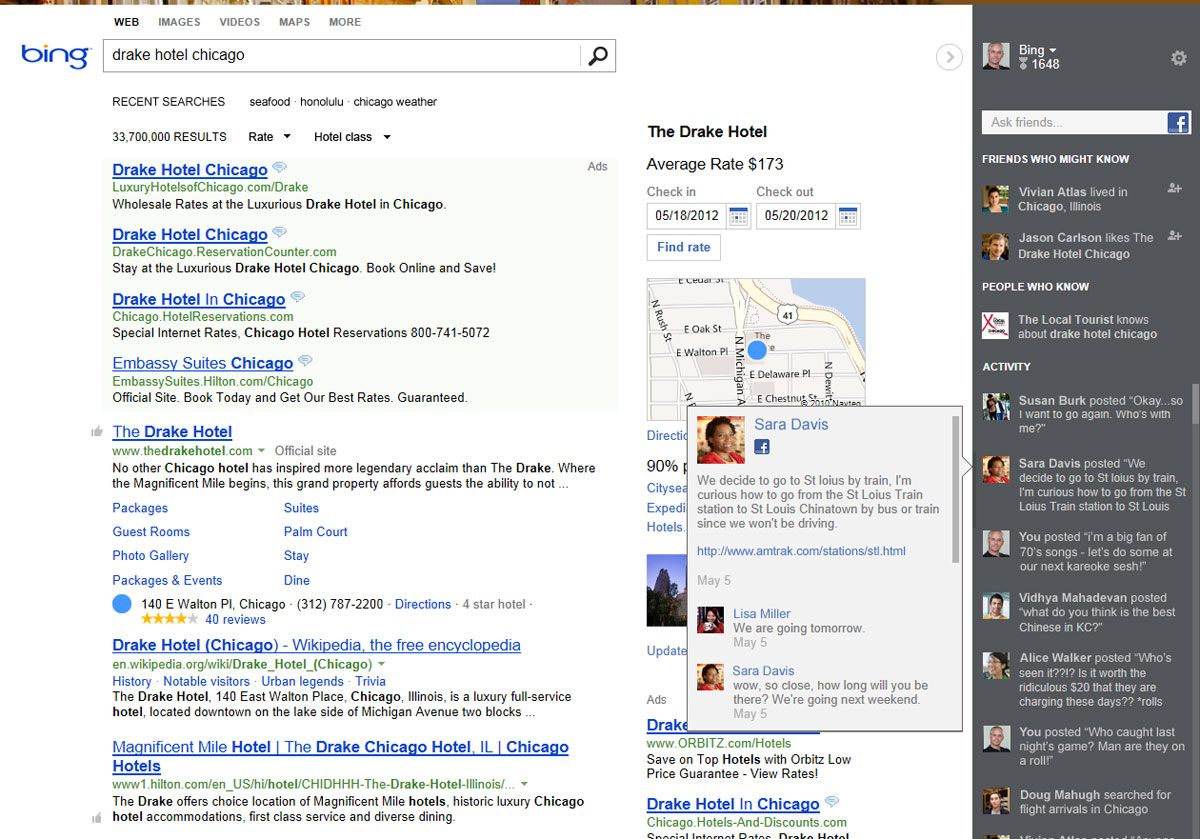 "For example, if you're searching for diving spots in Costa Rica, with the new Bing, you may discover that one of your Facebook friends knows a great spot, based on photos from their last trip to Costa Rica that they shared on Facebook. Or you might find a friend who lives in Costa Rica based on his or her Facebook profile. You and your friends can only see information you could already see about each other on Facebook" Microsoft