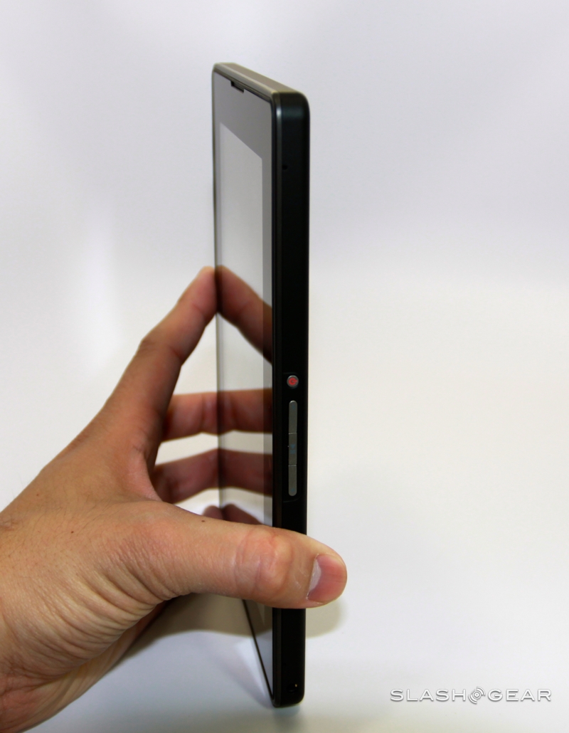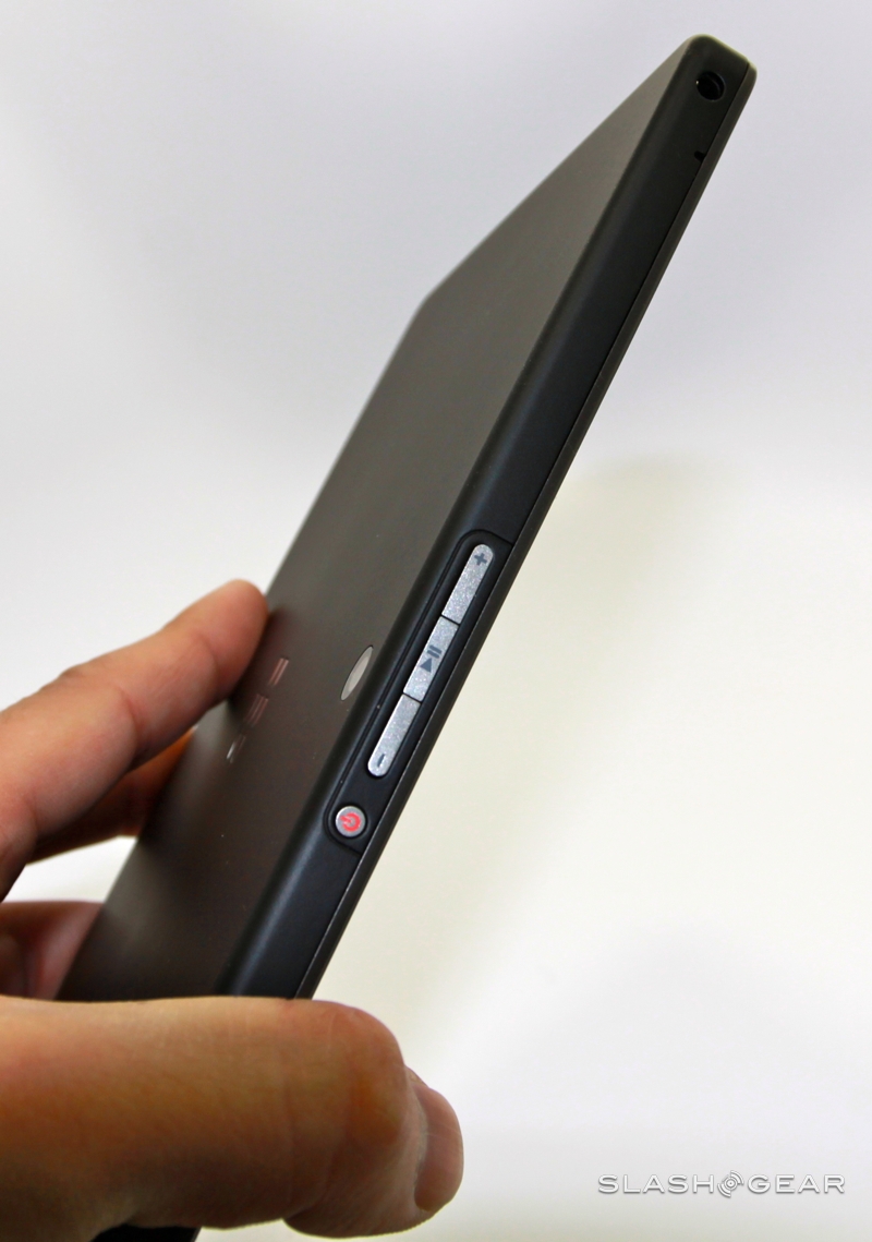 A nondescript black slab measuring 7.6 x 5.1 x 0.4 inches and weighing 0.9lbs, the PlayBook is a combination of the very glossy and the pleasingly matte. The whole front is a slab of glass hiding a 1024 x 600 WSVGA LCD touchscreen, the touch-layer of which extends – Palm Pre style – off into the bezel around the panel itself. The sides and back are metal with a rubberized coating for easier grip. Ports and controls are minimal, which makes it all the more frustrating that the one button you'll probably be spending the most time tapping, the power key, is such a frustration. Tiny, recessed and overly-sprung, it's hard to find without looking and hard to press without jabbing the tip of your finger at just the right angle.