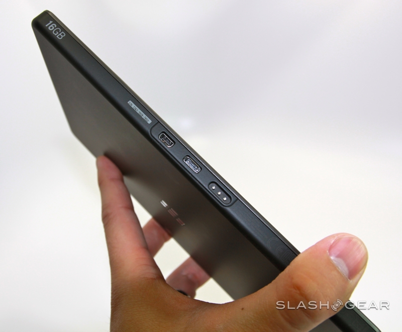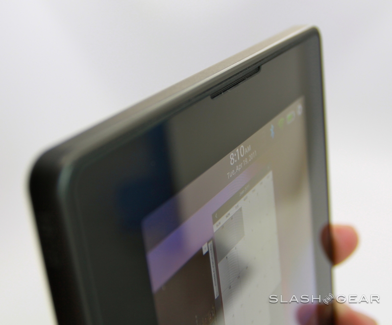 Next to it there are volume up/down keys flanking a play/pause button, and the 3.5mm headphone socket is on the top edge as well. On the bottom there's a microHDMI port, microUSB port, and a proprietary charging connector for the PlayBook's docking station. Rather than integrate the speaker grills into the sides or rear of the tablet, as we've seen other manufacturers do, RIM has sliced narrow gaps in the edges of the front glass, and slotted the speakers neatly behind them. The end result is solid audio performance.