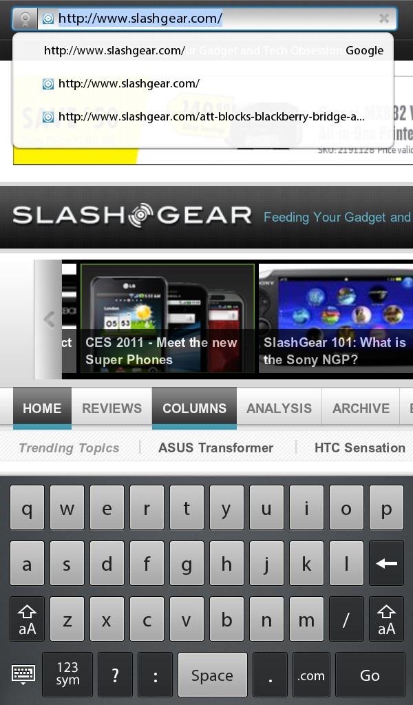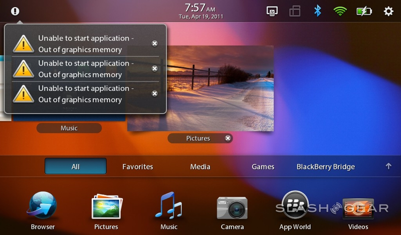 The patchy experience continues into the browser. WebKit based and with Adobe Flash support out of the box, the end experience should be desktop-like but suffers occasional rendering glitches, sluggishness in pages with more than a little Flash content, and tends towards memory hogging. QNX shows low memory status with glowing red in the corners of the display, and all too often we'd find that the browser would simply shut down of its own accord. To be fair, a similar thing can happen with the Safari browser on the iPad, but either way it's a jarring experience on what's arguably meant to be a web-centric device. We also had issues with navigating between pages, with overlapping icons and a tendency to get confused if we allowed our fingers to touch the bezel while holding it.