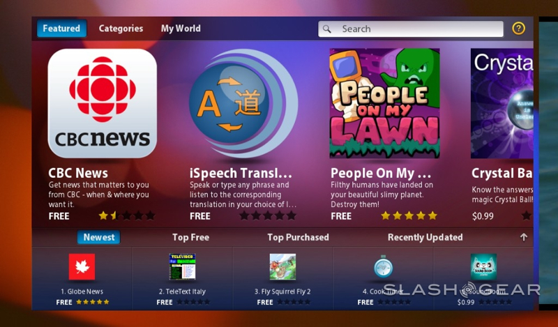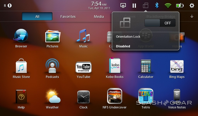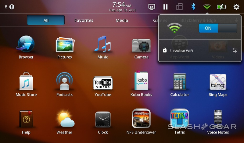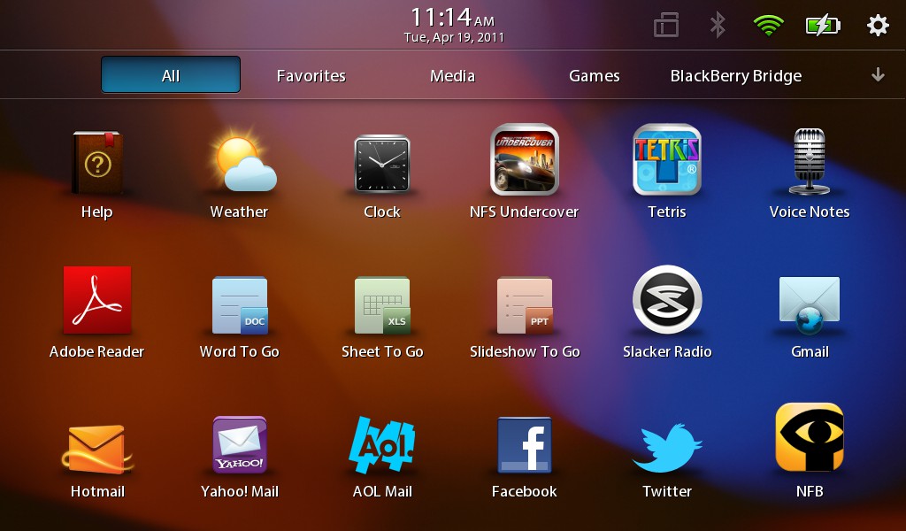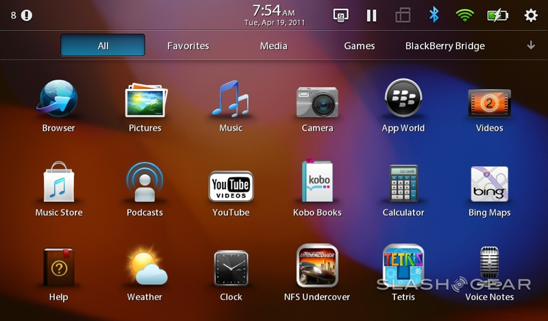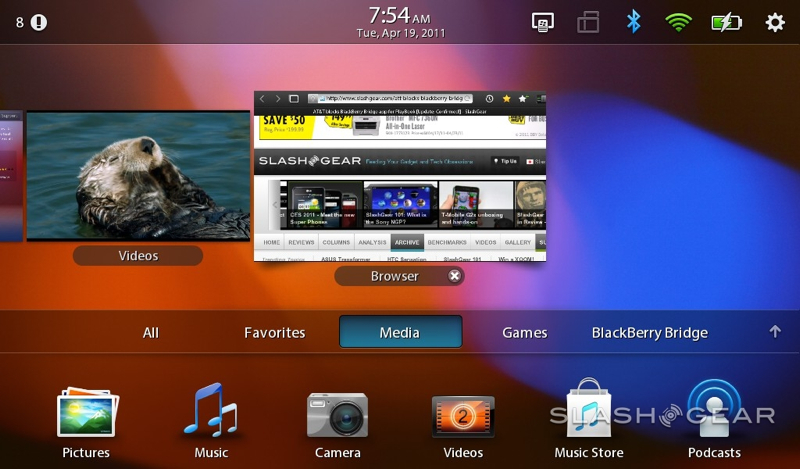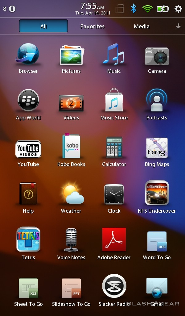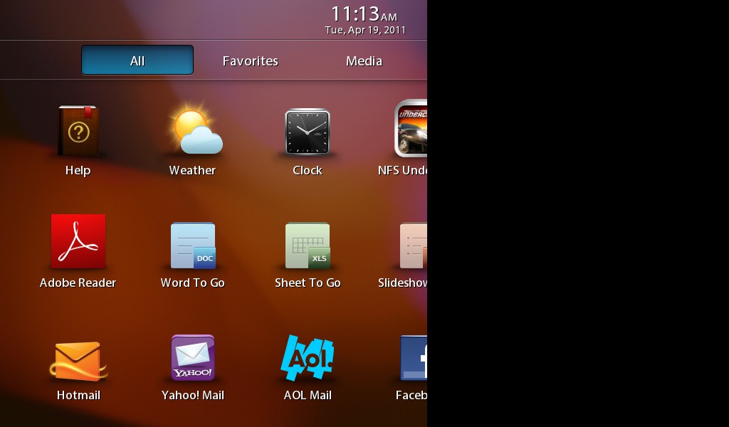 The PlayBook runs QNX, a Unix-like OS which RIM acquired a little over a year ago. It's a well-established platform that's more commonly found in embedded devices. To QNX, RIM's software engineers have added a splash of UI magic that borrows at least a little from some of our favorite software platforms of the moment. There are webOS-style swipe gestures, including the ability to power on the PlayBook by swiping all the way across the display from bezel to bezel, and iOS style icons which are rearranged by tapping and holding them until they animate.