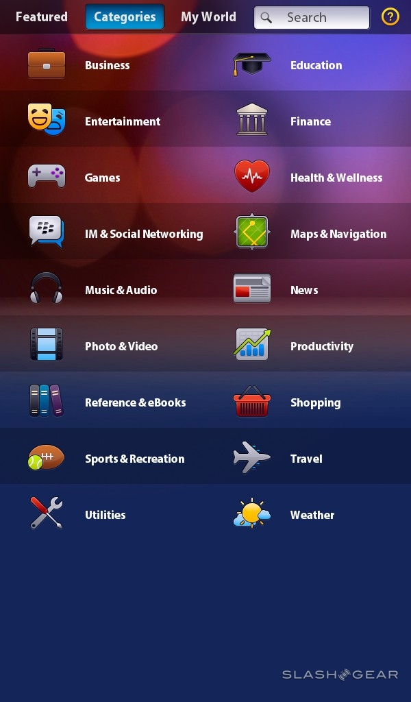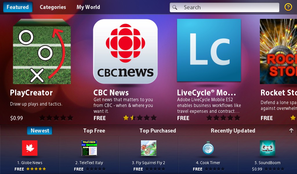 Unfortunately, the actual range of apps to take advantage of all that power is pretty limited. The PlayBook's software selection is its biggest drawback today, and it's one that RIM has tacitly acknowledged (but which we'll have to wait until later in the year to see addressed). Out of the box you get a browser, music app, video app, Adobe Reader, pictures app, calculator, Documents To Go and Kobo Books, along with access to the BlackBerry App World download store.