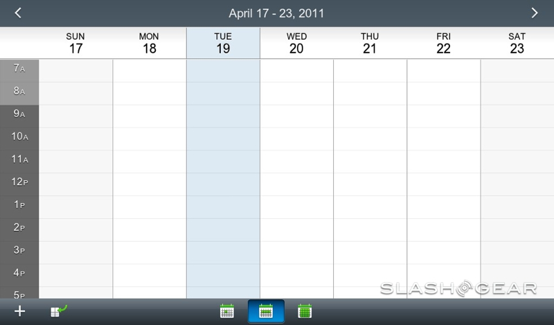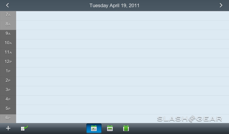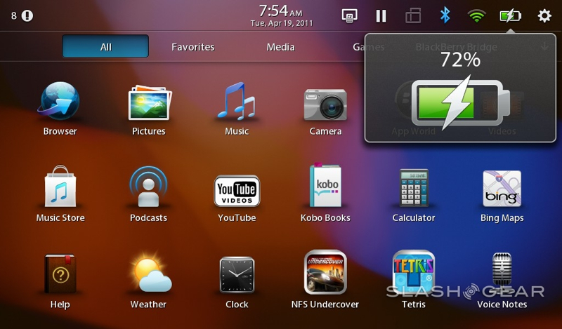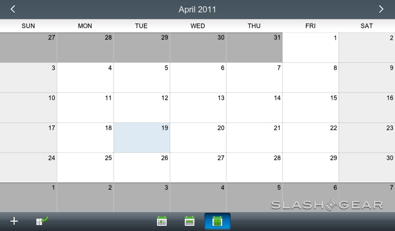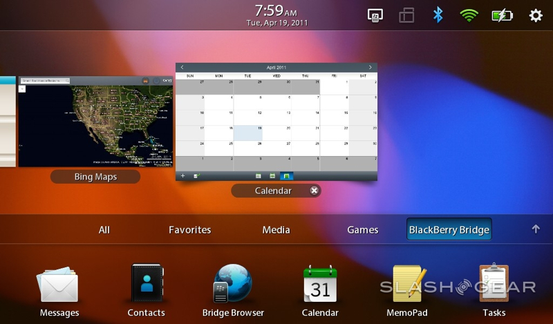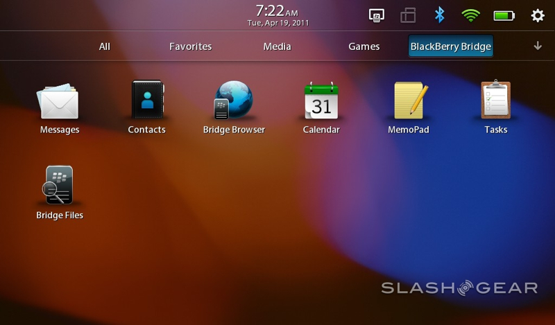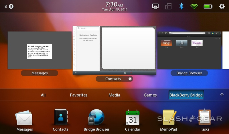 If you've noticed a few obvious omissions, like email, contacts, calendar, tasks and memos, then you've spotted RIM's most unusual software decision. Rather than having standalone apps for each of those features on the tablet, the PlayBook relies on its BlackBerry Bridge application to pull the content over from a Bluetooth-tethered BlackBerry smartphone. The handset needs to be on OS 5 or OS 6 and running the Bridge app, and once that's done it's just like using your BlackBerry phone but on a 7-inch screen (and with a UI to suit). The benefit to this, RIM argues, is that enterprise users needn't worry about securing a second device for each newly-tablet-equipped employee: the phone is secure, and the PlayBook just borrows its content for a while.