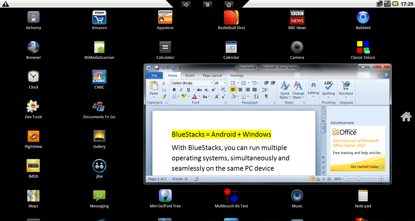 What BlueStacks developed is an extremely clean approach to delivering Android by virtualizing the full Android OS and running it on x86-based Windows PCs. They ran me through a demo on a 28-inch HP TouchSmart all-in-one PC. No dual boot needed and it ran the full version of Android 2.2 seamlessly. It loads as a virtual OS, and you can switch back and forth between them seamlessly. A user could be in a Windows app and collapse it to the task bar and open an Android app, use it, and then also collapse it to the task bar for later use. Multi-tasking between Android apps and Windows apps was one of the more compelling parts of the demo.