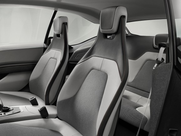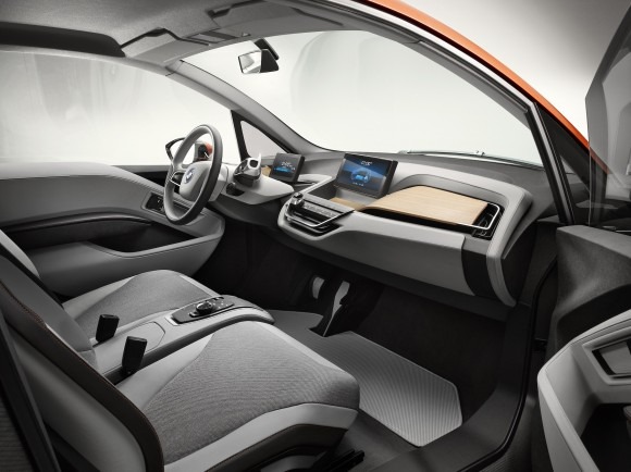 Inside, it's a mixture of leather, wool, wood, and other renewable materials, with an electronic gearshift and twin displays mounted across a swathe of eucalyptus wood (sourced from sustainably managed European forests, naturally). BMW's iDrive system is in the center panel between the front seats, but the space between the dash and where the transmission tunnel would normally be found is left empty. That makes the whole cabin feel more spacious, BMW says, but also allows for easier exiting the car on either side.
