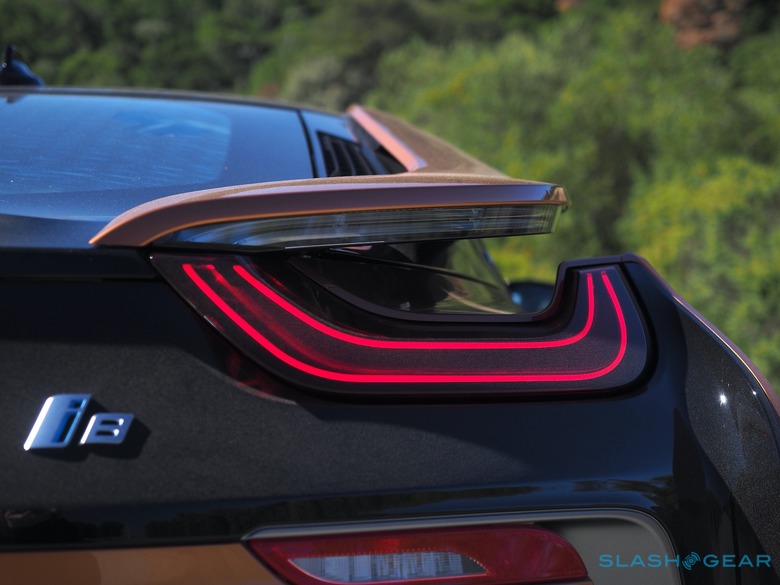 It leaves BMW's car feeling agile and urgent through twisting roads, the combination of all-wheel drive and a curb weight that's unusually light even today helping the i8 dart and pivot neatly. In Sport mode you get a weird electronic engine sound overlaid atop the thrumming turbo engine and the not-unpleasant whine of the electrics. It doesn't sound like something that should be enjoyable, but it oddly is.