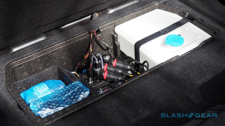 The really interesting part of the engine isn't even found under the hood, however. Open up the trunk and lift a hidden panel and you find a water injection system, fitted for the first time in an intercooled production car.