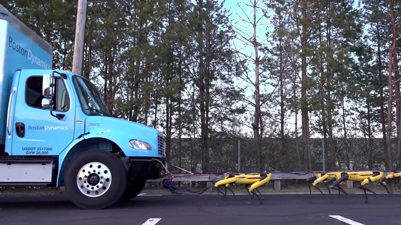 Boston Dynamics' SpotMini Robots Work Together To Pull A Truck