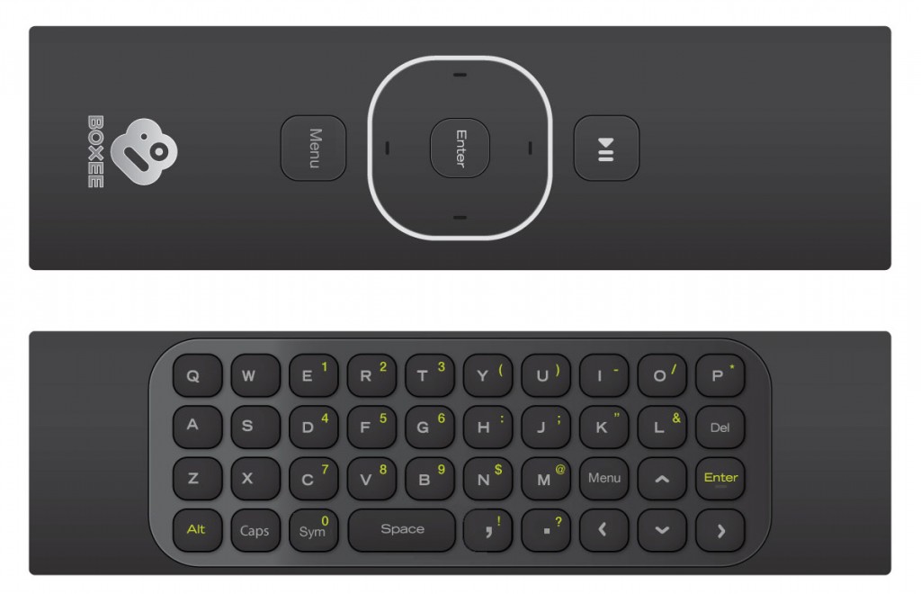On one side of the remote there's a standard D-pad with enter, menu and play/pause buttons, like you would find on an Apple remote. However on the flip side there's a QWERTY thumb-board, useful for web searches, quickly navigating media libraries and more.