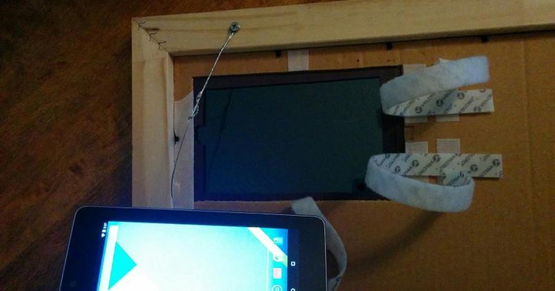 All you need is a cheap Android tablet, a 2-way mirror, a frame, some cardboard, and some Velcro. Once you've got your supplies, you can make a backing for the mirror out of cardboard and construction paper, with a hole the size of your tablet.