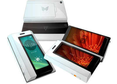 Butterfly is a horizontal slider with dual AMOLED touch-screens, which opens biased to an angle so as to give the familiar Nokia Communicator-style format. The lower screen then acts as a keypad for dialling and messaging, while you've got a broad top screen for web-browsing.