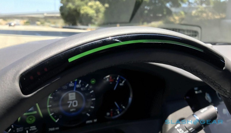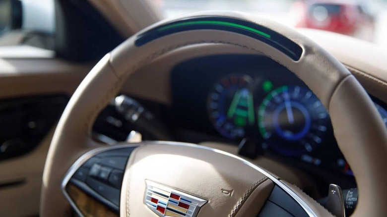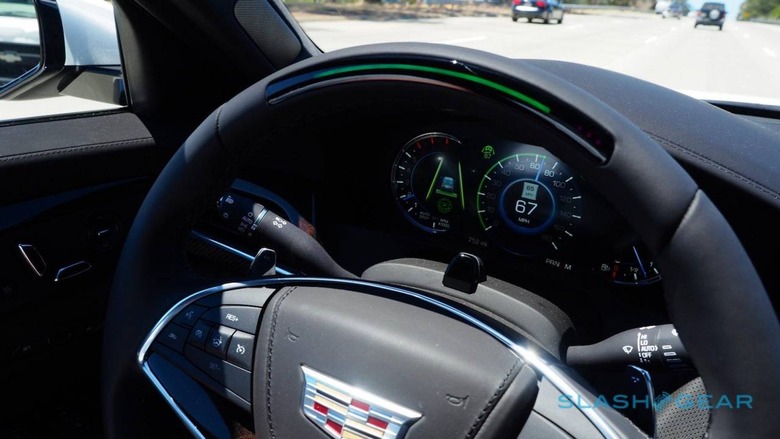 A light bar in the steering wheel communicates system status with the driver: red for when Super Cruise is inactive, green when it's operational, and blue when you're manually changing lanes. It can flash to grab your attention if the infrared camera on the steering column decides you're not paying the road enough mind.