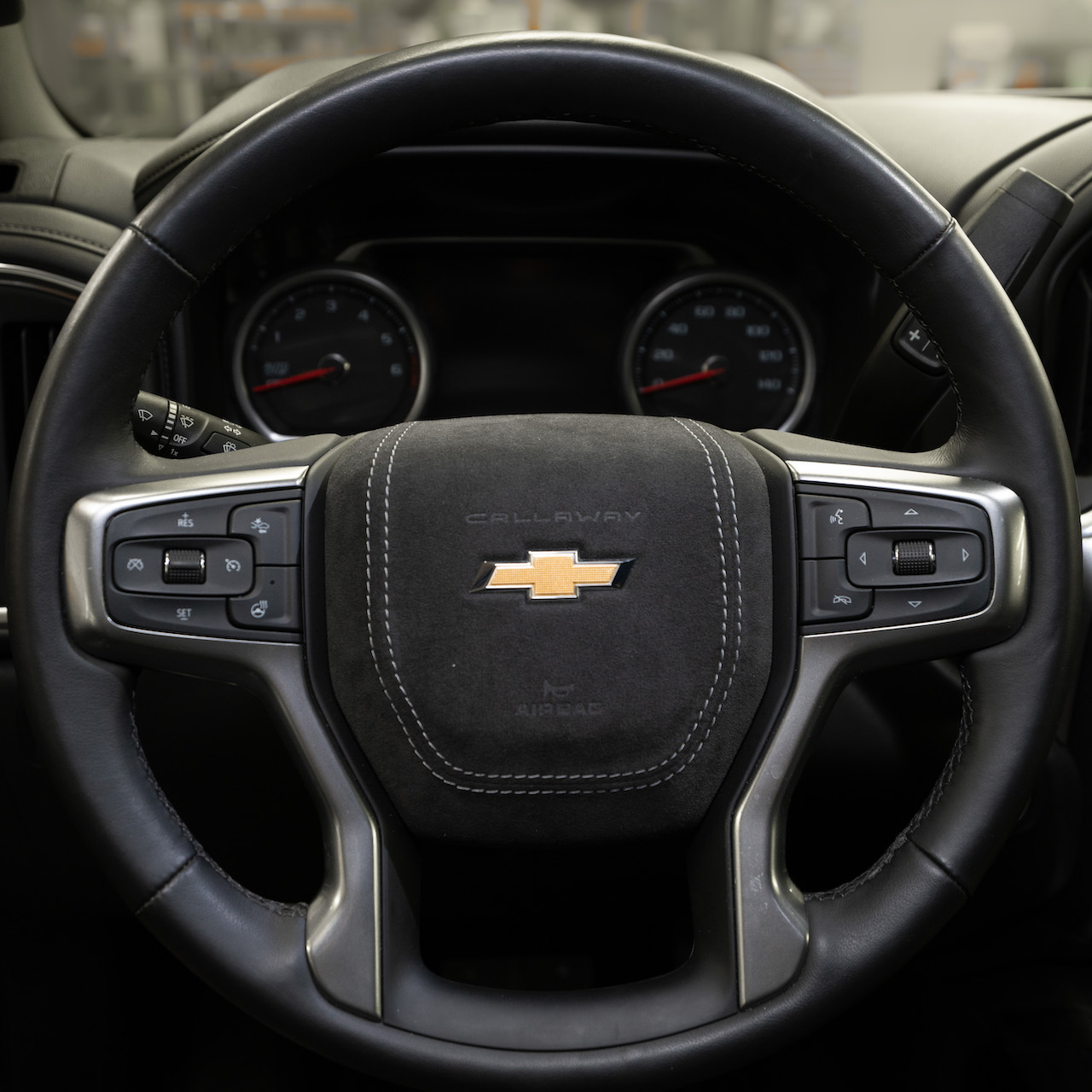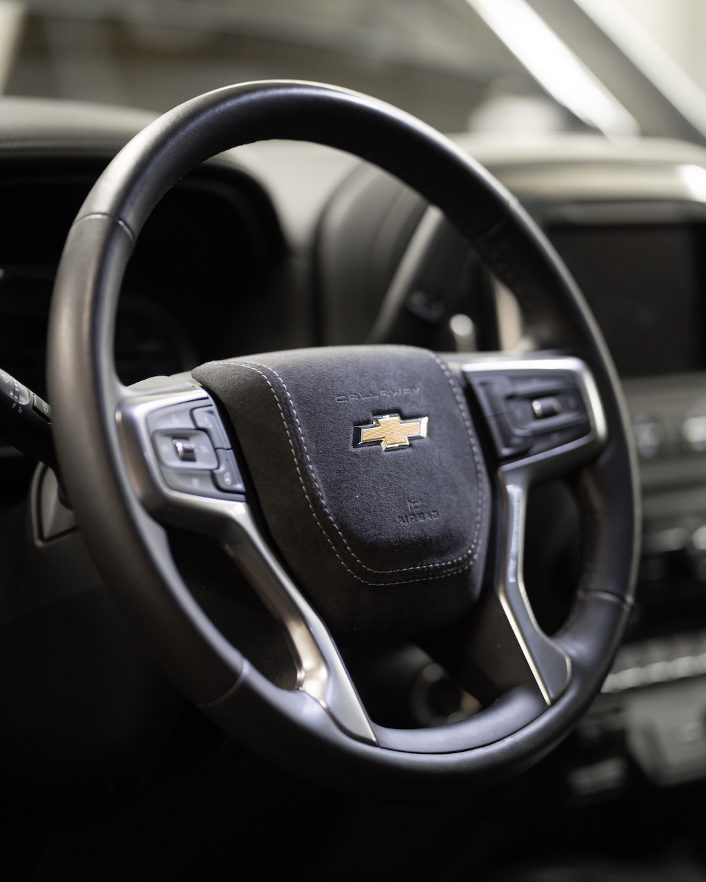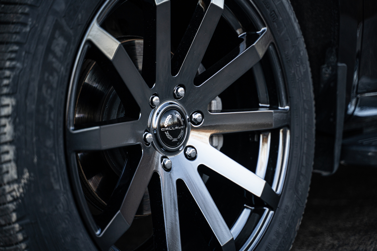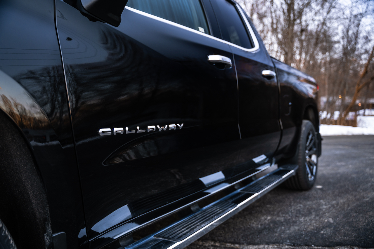 It may resemble a factory-stock Chevy Silverado from some angles, but there are telltale signs of the truck's outstanding stoplight-to-stoplight ability. Like those 20 or 22-inch Callaway lightweight wheels, for instance, or the bevy of chrome Callaway exterior badging, including a bold CALLAWAY script on the carbon fiber front grille.