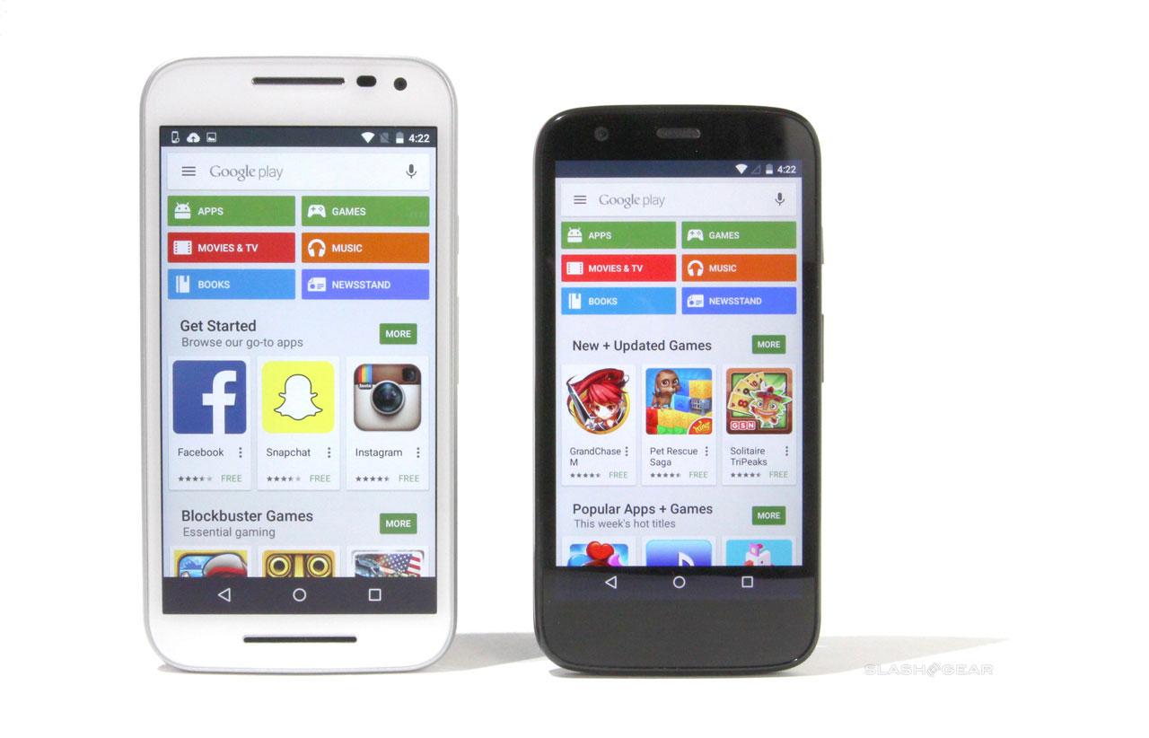 Moto G 3rd Gen• Display: 5-inch IPS LCD 720 x 1280 pixels• Processor: Qualcomm MSM8916 Snapdragon 410• RAM: 1GB RAM / 2GB RAM• Camera: 13 MP, 4128 x 3096 pixels, autofocus, dual-LED (dual tone) flash, 1080p @ 30fps, 720p SloMo• Front-facing Camera: 5 MP• Battery: 2470 mAh• Internal Storage: 8GB / 16GB• Micro-SD card slot: Yes, up to 32GB