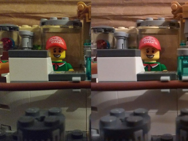 Photographed indoors under a very standard incandescent bulb-blasting yellow light, this LEGO Pizza Boy Minifigure should show you how these devices act when in relatively dim lighting conditions in a macro situation.