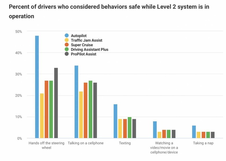 "Autopilot also had substantially greater proportions of people who thought it would be safe to look at scenery, read a book, talk on a cellphone or text," the IIHS reports. "Six percent thought it would be OK to take a nap while using Autopilot, compared with 3 percent for the other systems."