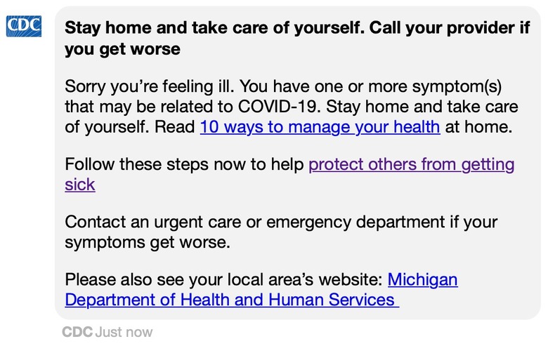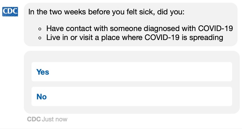 After that, it goes through some of the symptoms we've become more familiar with from coronavirus warnings. That includes fever or feeling feverish, shortness of breath, and coughing. The CDC's tool also checks whether the person taking the test has been to a place where there has been a severe coronavirus outbreak, or in contact with someone with a known COVID-19 infection.