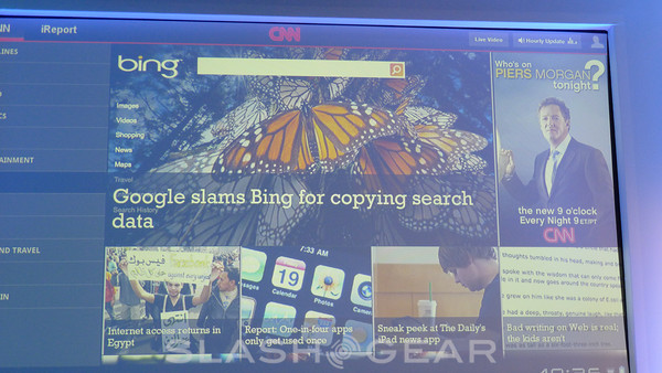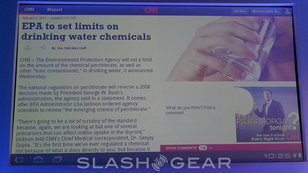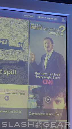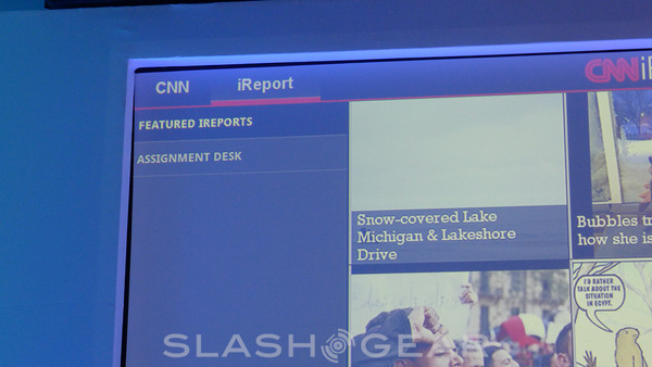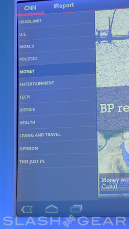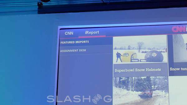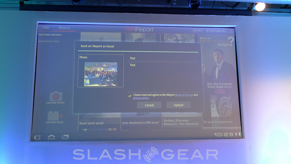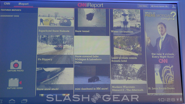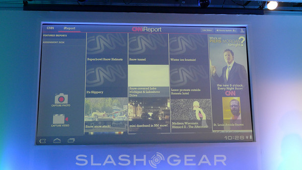 Head stories as well as breaking news are shown instantly via Honeycomb in this CNN app. A CNN rep by the name of Lila shows iReport – a portion of the CNN app that allows people to share videos and photos from wherever they happen to be in the world. This piece of CNN's master Android plan will also soon be available as an app on the Honeycomb-based tablet. How they'll avoid all sorts of inappropriate images and videos, we don't know. This is where CNN gets all of their "on the spot" coverage, like the skit on SNL. They hope that with the combination of all of the different elements they'll be collecting and spreading with these apps, a new form of news will grow.