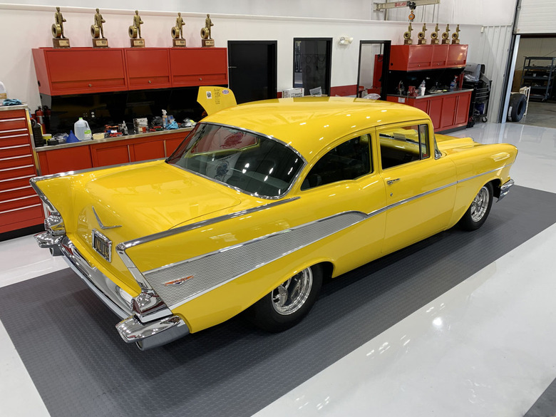 Ditching the combustion engine allowed the team to remove the exhaust system, which allowed the car to be lowered by two inches. The electrified powertrain the car is getting installed is also lighter, so the car is being changed to utilize softer front springs and stiffer rear springs. While the vehicle is getting a modern electrified powertrain, it still looks like a classic 1957 Chevrolet on the outside. The only change to its interior is a push-button gear selector used in the 2021 Chevrolet Corvette.
