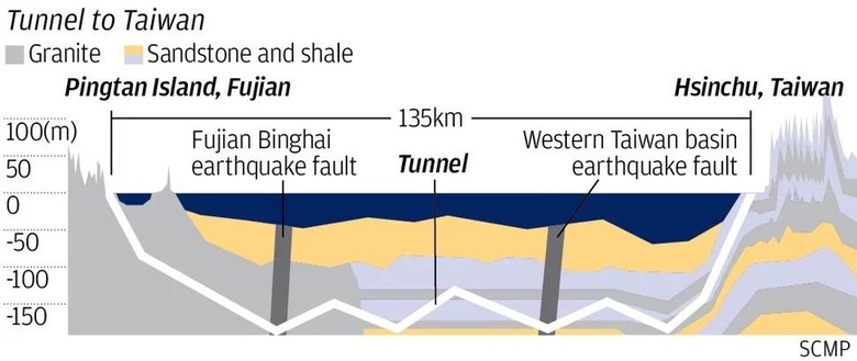 In addition to the distance that has to be covered, the tunnel would have to be designed around two earthquake faults on both Chinese and Taiwanese sides of the line. One end of the tunnel will be located at the free-trade zone in Pingtan, Fujian province. The other will end at the Taiwanese coastal city of Hsinchu.