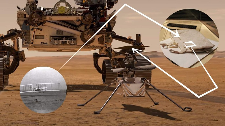 The 1903 Wright Flyer I is the craft that made the first controlled, sustained flight on Earth with a powered, heavier-than-air, piloted machine. They've taken a part of this original craft and placed it onboard the NASA Ingenuity. NASA Ingenuity will soon be "the first heavier-than-air aircraft to make the first powered, controlled, and sustained flight on another world."