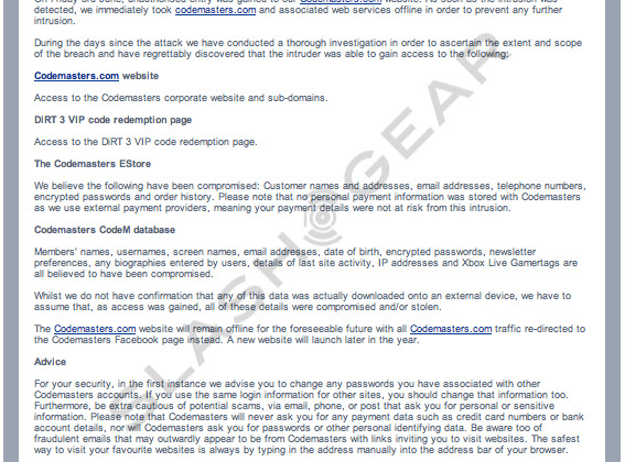 According to our tipsters, this is not the first time this has happened, though this attack is certainly the more important of two in this past month. The attack earlier this month on Codemasters website may or may not have been the same person or group, but accessed only usernames of people signed up for the site, whereas this newest attack has proven to have been much more serious. While Codemasters says they have no confirmation that user data has actually been stolen or compromised, they're assuming the worst, and are telling users via email to take all precaution including changing passwords on their accounts on all fronts as well as being prepared for ams through email, phone, and snailmail.