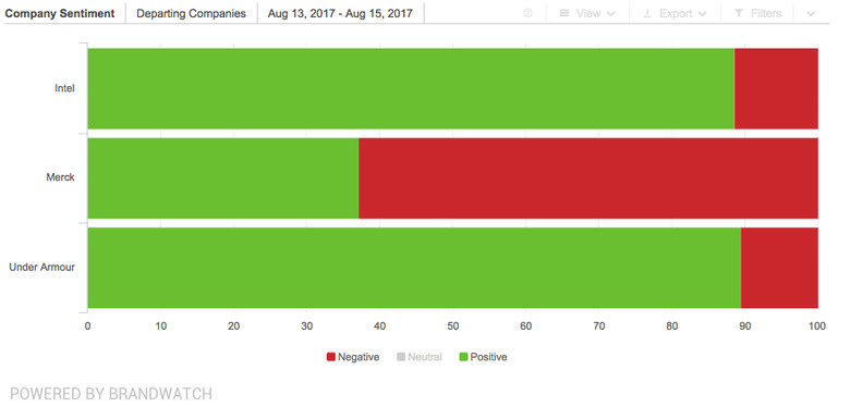 A third company – Merck – found themselves at the center of attention as company CEO Kenneth Frazier was bullied by Trump after leaving the council this weekend. Trump's Twitter outburst about Frazier's exit generated many negative comments on open forums like Twitter, thus creating a bit of a paradox in the chart you'll see below. As Business Insider mentions, the algorithm Brandwatch uses cant decipher context, and so finds outrage on behalf of Merck's CEO just as "negative" as negative comments toward the company.