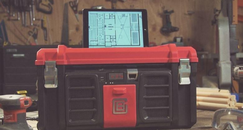 Joining these things is an integrated bottle opener, USB ports, a power bar, tablet stand, and Bluetooth speakers. The integrated battery will run the features when the toolbox isn't plugged in, as well as some smaller tools like a sander or a drill. You'll get about 10 hours of use from the battery when using the USB ports, for example, and 7 hours when using the speakers, while a sander will get about 48 minutes and a drill will be able to drill about 1400 screws.