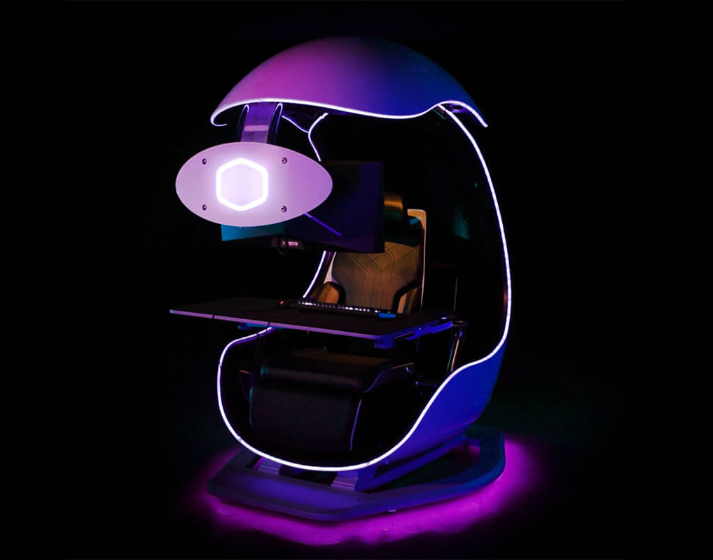 The Cooler Master Orb X GamePod is a "fully immersive multi-purpose semi-enclosed workstation" intended for both gamers and professional computer users. This piece of hardware has an egg-like shape with a chair at the center, multi-colored light strips on its edges, and the ability to support up to three 27-inch monitors inside. This workstation was designed with "full immersion in mind"