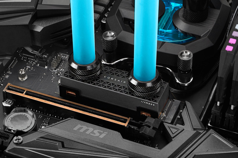 The Corsair MP600 PRO Hydro X is the most strange and awesome SSD we've ever seen – so long as it's plugged in with the components you see above. This device works with its own integrated CORSAIR Hydro X Series XM2 water block. This block connects "seamlessly" to said SSD and into your already in-play custom cooling loop.