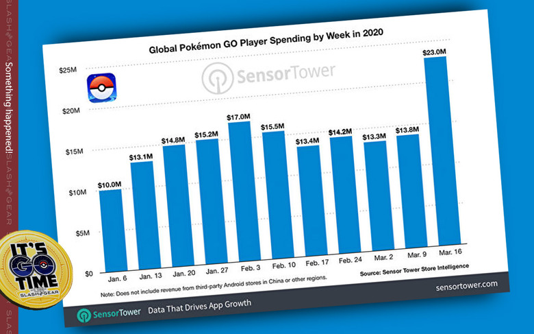 In mid-March, Niantic announced that they'd made some changes to allow people to play without leaving their home. That same week, spending by players ramped UP. The week of March 9, spending was around $13.8 million. The week of March 16, spending was up to $23 million. That's a boost of 67%.