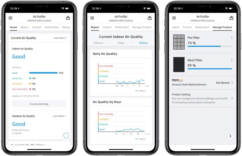 Part of the problem is that Coway actually changed its app. The original was, in my opinion, much easier to use. Its replacement is functional – you can manage multiple purifiers from a single account, including controlling all the front panel features remotely – but it doesn't look as elegant and it can be clunky in its operations.